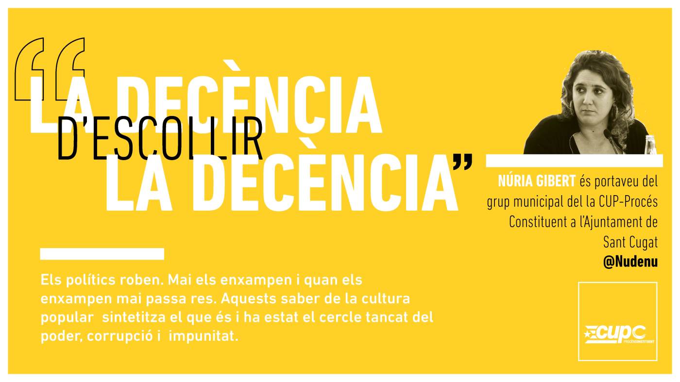 Els polítics roben. Mai els enxampen i quan els enxampen mai passa res. Aquests saber de la cultura popular sintetitza el que és i ha estat el cercle tancat del poder, corrupció i impunitat. Fins i tot davant l’evidència evident, que l’antiga CDC ara PDCAT s’han estat embutxacant diners de les obres públiques de la nostra ciutat, la sensació generalitzada és que aquí no pagarà ningú i molt pitjor, això seguirà passant.