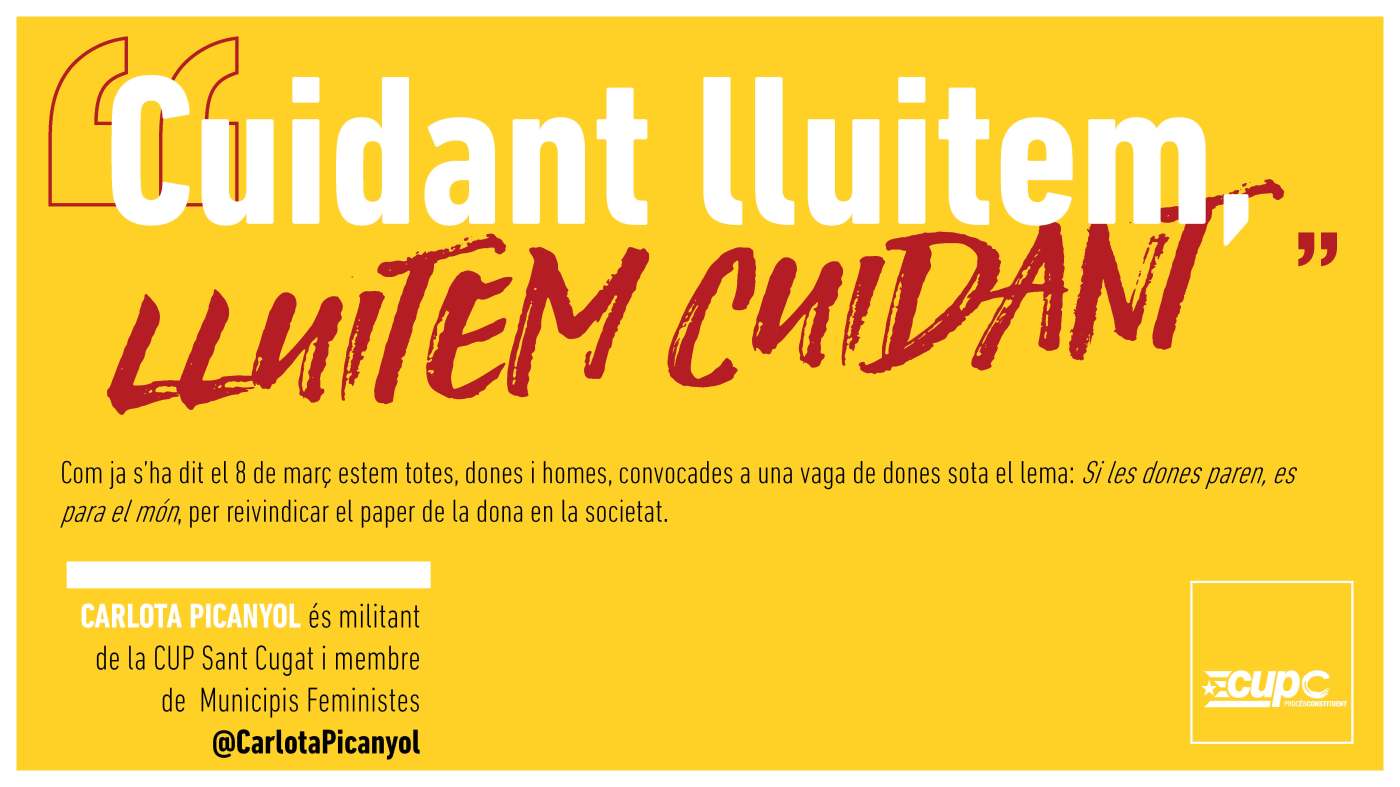 A part de la tradicional vaga laboral i de consum, durant la vaga feminista les dones estem convocades a fer una vaga de cures. I és justament aquest punt en què cal que ens aferrem amb més força. Al posar l’accent en la necessitat de reivindicar l’esfera de les cures la lluita ha trencat les fronteres de l’extern i adopta una dimensió molt més introspectiva, privada i s’ha instal·lat a les cases de totes per quedar-s’hi.
