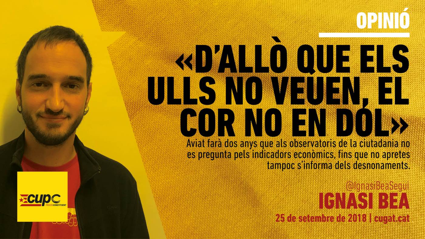 D’allò que els ulls no veuen, el cor no en dol, que diu la dita. Ojos que no ven, corazón que no siente, en castellà. I, de la mateixa manera que aviat farà dos anys que als observatoris de la ciutadania no es pregunta pels indicadors econòmics, fins que no apretes tampoc s’informa dels desnonaments. Potser el fet que, des de l’esclat de la crisi i de manera sostinguda, un percentatge gens menyspreable de santcugatencs (al voltant del 17%) passés dificultats per pagar l’habitatge, la llum, l’aigua o el gas hi té alguna cosa a veure. Potser que un de cada quatre tingués problemes per arribar a final de mes que un de cada tres no pogués estalviar ni un euro hi tenen a veure. I ho dic en pretèrit perquè fa dos anys que les preguntes sobre aquests temes van desaparèixer de l’observatori sociològic que encarreguem des de l’Ajuntament i, òbviament, paguem entre tots i totes.