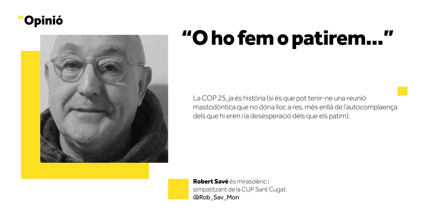 El que sí que ha deixat ben clar la vint-i-cinquena COP és que no serveixen de res, i per tant, les solucions davant de la gran i negativa realitat climàtica, que genera emergència social (https://www.youtube.com/watch?v=3Su47X-BIhM) està en les persones i en la seva organització de base. I de manera molt especial a escala municipal.