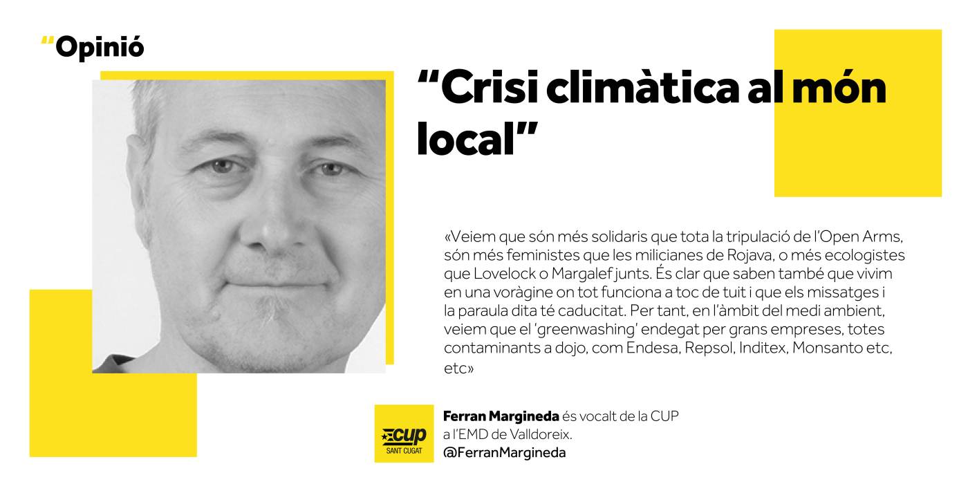 Però això fa temps que no passa inadvertit entre els partits tradicionals i d’ordre, que en són conscients i mimetitzen missatges i posicionaments clarament ubicats molt a l’esquerra del que els faria sentir còmodes, per no perdre influència i quotes de poder. Veiem que són més solidaris que tota la tripulació de l’Open Arms, són més feministes que les milicianes de Rojava, o més ecologistes que Lovelock o Margalef junts. És clar que saben també que vivim en una voràgine on tot funciona a toc de tuit i que els missatges i la paraula dita té caducitat. Per tant, en l’àmbit del medi ambient, veiem que el ‘greenwashing’ endegat per grans empreses, totes contaminants a dojo, com Endesa, Repsol, Inditex, Monsanto etc, etc, són els primers a fer servir estratègies de màrqueting per posar-se davant d’una causa que preocupa a la gent.