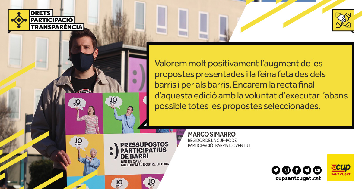 “Valorem molt positivament l’augment de les propostes presentades i la feina feta des dels barris i per als barris. Encarem la recta final d’aquesta edició amb la voluntat d’executar l’abans possible totes les propostes seleccionades”, explica Marco Simarro, regidor de Participació i Barris i Joventut. Des de la regidoria, la CUP seguim treballant per a que les veïnes de Sant Cugat puguin tenir poder decisiu en les accions que es fan des del govern.