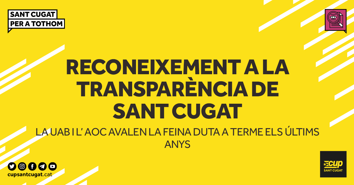 L’Ajuntament de Sant Cugat ha vist reconeguda la seva tasca amb relació a la transparència digital per la Universitat Autònoma de Barcelona (UAB) i l’Administració Oberta de Catalunya (AOC). Ambdues administracions han avalat la feina per apropar l’administració a la ciutadania a través de la transparència i del foment de la participació.