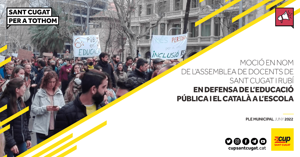 La CUP-PC, en nom de l’Assemblea de Docents de Sant Cugat i Rubí, presenta al proper ple municipal de juny una moció que recolza les reivindicacions de la comunitat educativa entorn de la millora de l’educació pública i la defensa del català; i insta al Conseller d’Educació Josep González Cambray a negociar i arribar a acords amb els sindicats de docents.