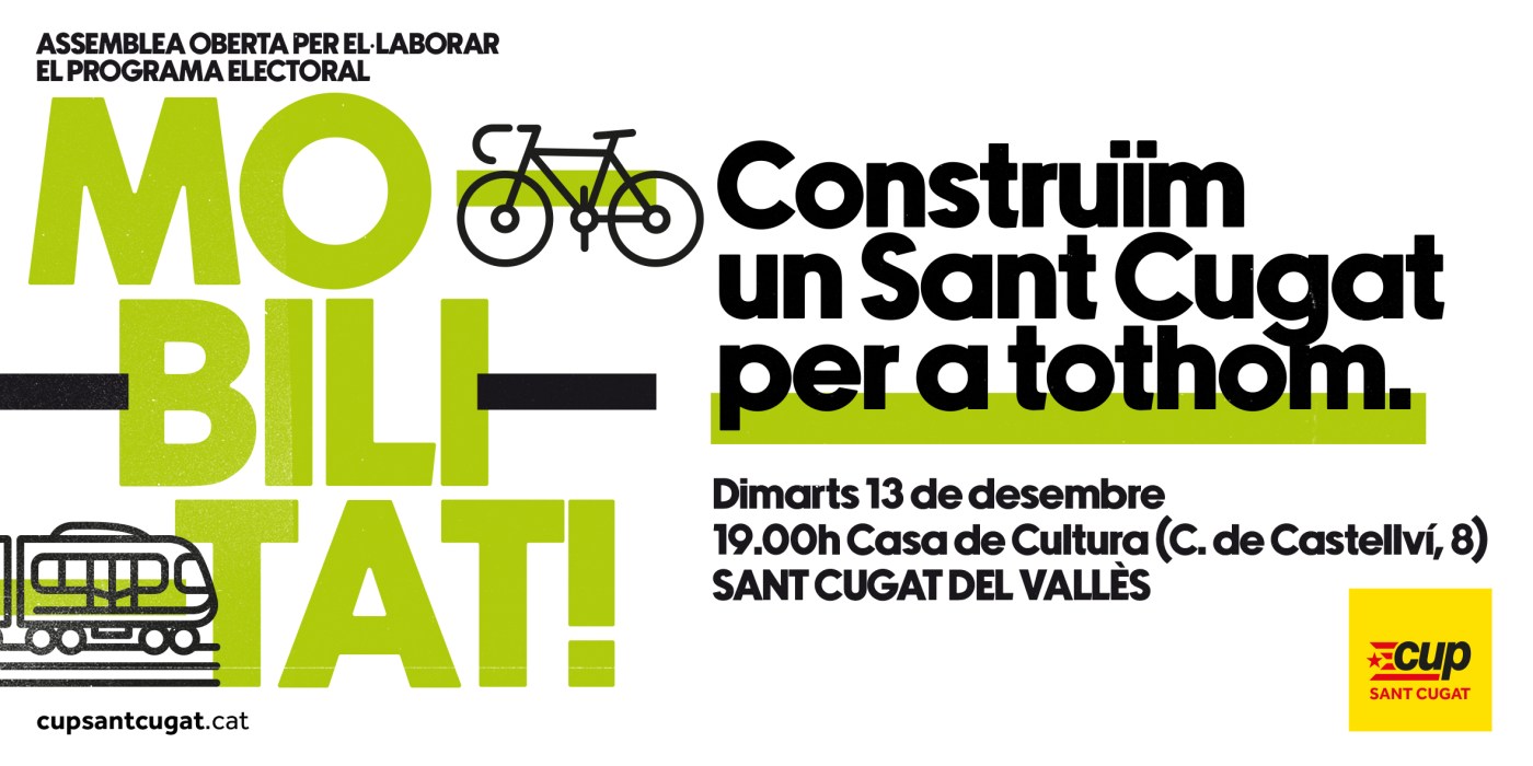 La CUP Sant Cugat celebrarà la segona trobada de preparació sobre mobilitat. Serà oberta a tots els veïns i veïnes que vulguin participar, i es durà a terme el dimarts 13 de desembre a partir de les set de la tarda a la Casa de Cultura.
