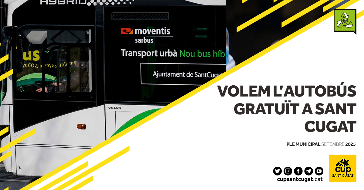 Per tot això, la CUP proposem tot un seguit de mesures per millorar el transport d’autobús de la ciutat, la més destacada de les quals és que els veïns i veïnes de Sant Cugat no hagin de pagar per anar amb autobús a la seva ciutat, atès que només amb la gratuïtat i aquestes millores el bus urbà podrà ser un veritable servei públic de qualitat, útil i universal.