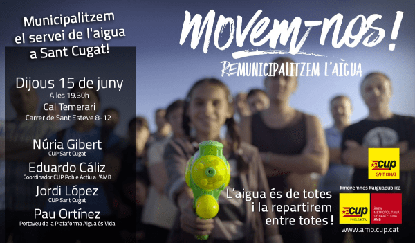 El proper 15 de juny a les 19:30h a Cal Temerari, la CUP Sant Cugat, juntament amb els representants de la CUP a l'Àrea Metropolitana de Barcelona (AMB) han organitzat una xerrada per parlar de la municipalització del servei d'aigua a Sant Cugat. En aquesta xerrada hi participarà Núria Gibert (portaveu del Grup Municipal de... Continue Reading →