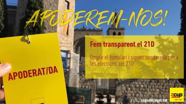 La CUP obre aquest formulari perquè totes aquelles persones que desitgeu donar-nos un cop de mà com apoderades en la jornada electoral del 21 de desembre, pugueu inscriure-us-hi i facilitar-nos la recopilació de dades, així com vetllar per a que la jornada electoral transcorri dins la normalitat i neutralitat desitjable. La inscripció requereix tenir disponibilitat durant... Continue Reading →