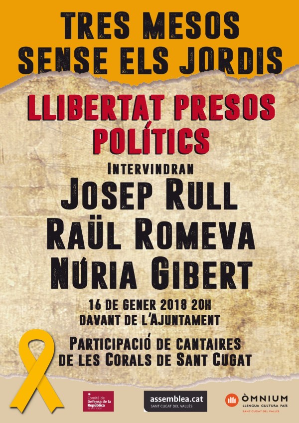 Sota el lema de Tres mesos sense els Jordis; Llibertat presos polítics, el nucli local de l'Assemblea Nacional Catalana, juntament amb Òmnium de Sant Cugat i el Comitè de Defensa de la República de Sant Cugat organitzen un acte que comptarà amb la presència d'un representant de cadascun dels partits sobiranistes presents al Parlament de... Continue Reading →