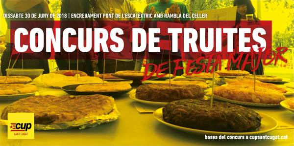 Aquest proper dissabte 30 de juny de 2018 la CUP de Sant Cugat organitza el ja consolidat concurs de truites de la Festa Major Alternativa. Un concurs en que any rere any creix la participació i originalitat dels plats presentats. Bases del Concurs de truites de la FMA 2018 Les truites que es presentin a... Continue Reading →