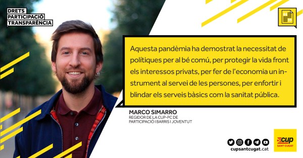Demà dijous 19 de novembre de 2020, el regidor de la CUP de participació i barris Marco Simarro, pren possessió de l’acta de conseller comarcal al Consell Comarcal del Vallès Occidental. Simarro entra com a suplent de Maties Serracant, ex- alcalde de Sabadell per la Crida per Sabadell el mandat anterior i regidor al mateix... Continue Reading →