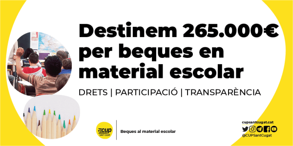 S’engega a Sant Cugat una convocatòria de beques al material escolar inèdita, per tal de garantir de manera completa el dret d'escolarització de tots els infants de la ciutat. Es destinaran 265.000€ a la convocatòria, el que representarà entre 50 i 150€ per a cobrir despeses vinculades a llibres de text, material, equips informàtics i... Continue Reading →