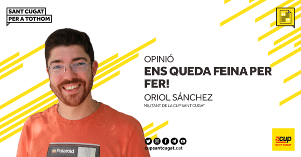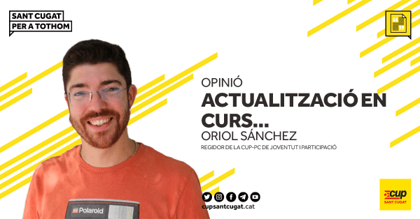 El divendres passat, 17 de juny des de la CUP Sant Cugat vam comunicar que jo, Oriol Sánchez, seré el regidor que entrarà en substitució de la Núria Gibert. En el meu cas assumiré les regidories de Joventut i Participació i Barris. Aquest relleu no és una decisió fruit de la improvisació o les presses,... Continue Reading →