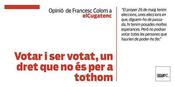 El proper 26 de maig tenim eleccions, unes eleccions en que, diguem-ho de passada, hi tenim posades moltes esperances. Però no podran votar totes les persones que haurien de poder-ho fer. El dret de vot actiu (votar) i passiu (ser votat) és un dret necessari per la vinculació i l’arrelament de les persones a la... Continue Reading →