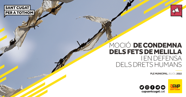El proper ple municipal, previst pel dilluns 18 de juliol, comptarà amb una moció que ha presentat la CUP-PC de la mà d’Esquerra Republicana i la Xarxa Solidària condemnant la mort de desenes de persones migrants a Melilla quan intentaven creuar la frontera, marcada per la brutalitat policial de les forces de seguretat espanyoles i... Continue Reading →