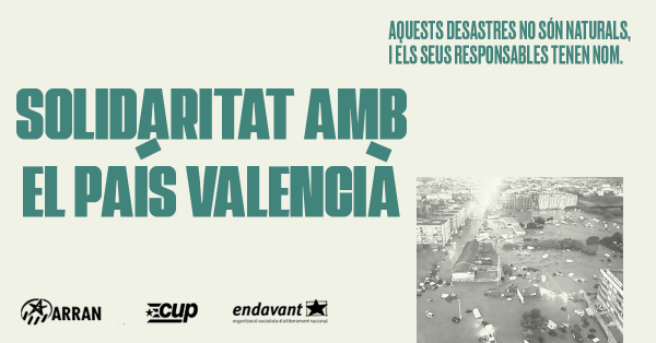 L’Esquerra Independentista de Sant Cugat (Arran, Endavant i CUP) mostrem la nostra solidaritat i posem els nostres recursos humans i econòmics al servei de les persones afectades i del conjunt del poble valencià, i valorem la ràpida resposta dels veïns i veïnes de Sant Cugat, organitzats des de moltes bandes per donar el seu suport.... Continue Reading →