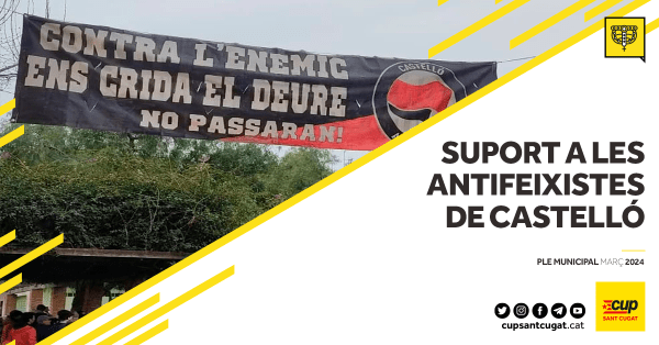 El ple de març de Sant Cugat expressarà en forma de declaració de la Junta de Portaveus el seu suport al centre social de Castelló la Cosa Nostra, així com el seu rebuig a les agressions patides a mans d’un grup organitzat de neonazis durant les festes de la Magdalena. Aquesta declaració neix arran d’una... Continue Reading →