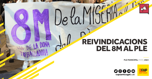 Un cop passat el 8 de març, la CUP Sant Cugat volem que les demandes i reivindicacions del moviment feminista tinguin una resposta per part de les institucions, i que l’ajuntament agafi un ferm compromís amb aquestes. En aquest sentit, portarem algunes d’aquestes reivindicacions al ple de març amb una moció per la democratització i... Continue Reading →